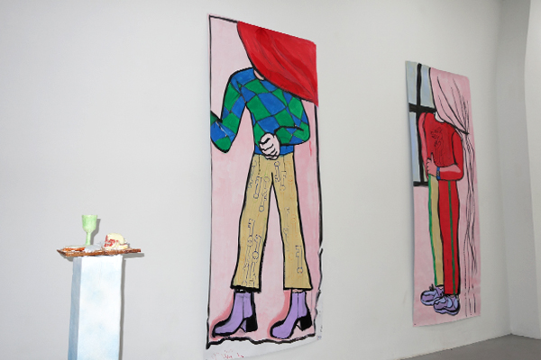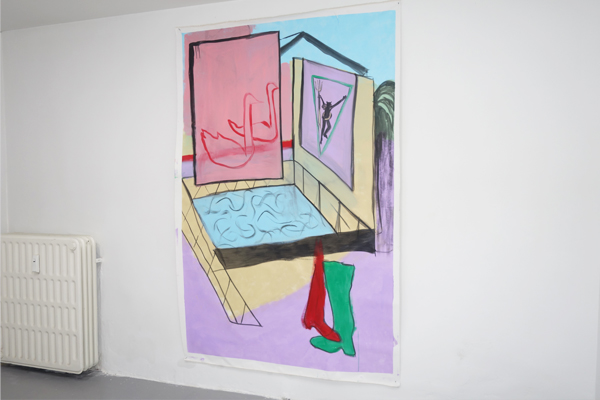 Her colorful works are often on a thin line between drawing, painting and installation. Her latest themes arouse around all the different depictions of the palm tree and its numerous shapes, mysterious legs of people without identity and swimming pools. Often a mix of paradise views combined with more earthly, humorous or surreal elements.